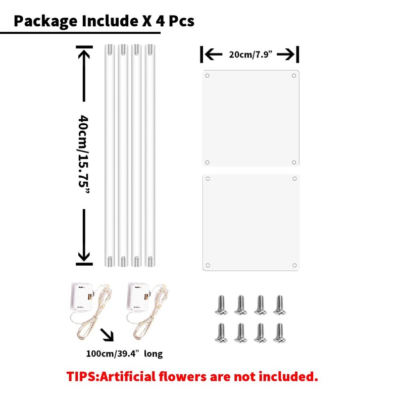 - 5.【Purchase Tips】 The package contains 16 acrylic strips,8 square bases components of the stand. A screwdriver and 1 pack of screws. 8 pack(40inch long) Led fairy string light, you can use it to decorate this flower stand .Please note that the flowers and artificial plants are not included in this set. If you are not satisfied with the product or have any questions, please feel free to contact our, we will quickly provide satisfactory solutions. Thank you for your purchase!
