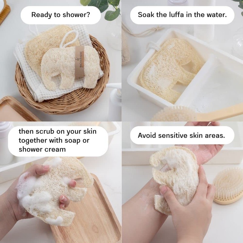 - Soak the luffa in the water then scrub on your skin together with soap or shower cream. Avoid sensitive skin areas. After you use your loofah,use a dry towel to thoroughly wring out moisture and get it dry. Put it in a cool, dry place outside of your bathroom. Recommends throwing out your loofah every 3 to 4 weeks.