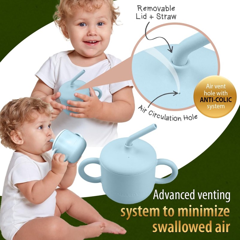 THALEDY Silicone sippy cup for 6 month old baby (8Oz/250ml) with straw, sippy cup for toddlers with soft spout and lid for practicing with snacks and sippy cup for 1 year old with handles.