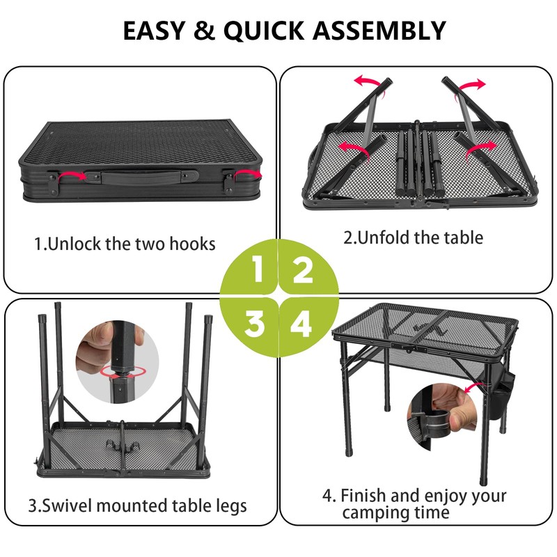 - [Easy to Use] The camping grill table has an extended size of 23.7” L x 15.8” W, providing plenty of space.Assembly is straightforward, requiring only four simple steps to complete.Please note that when unfolding, press the triangular structure for stability. When collapsing, bend the triangular structure with your hands for easier compacting.