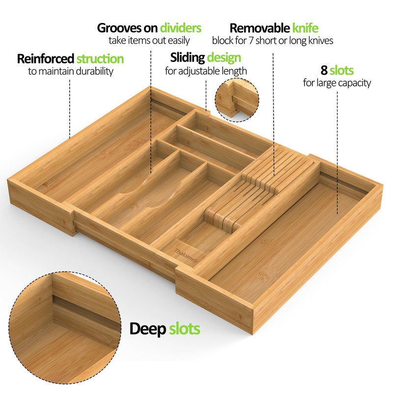 Thalomely Bamboo Kitchen Drawer Organizer, Expandable Utensil Organizer with Removable Knife Block, Cutlery Tray Holder with Divider,Adjustable Silverware Organizer