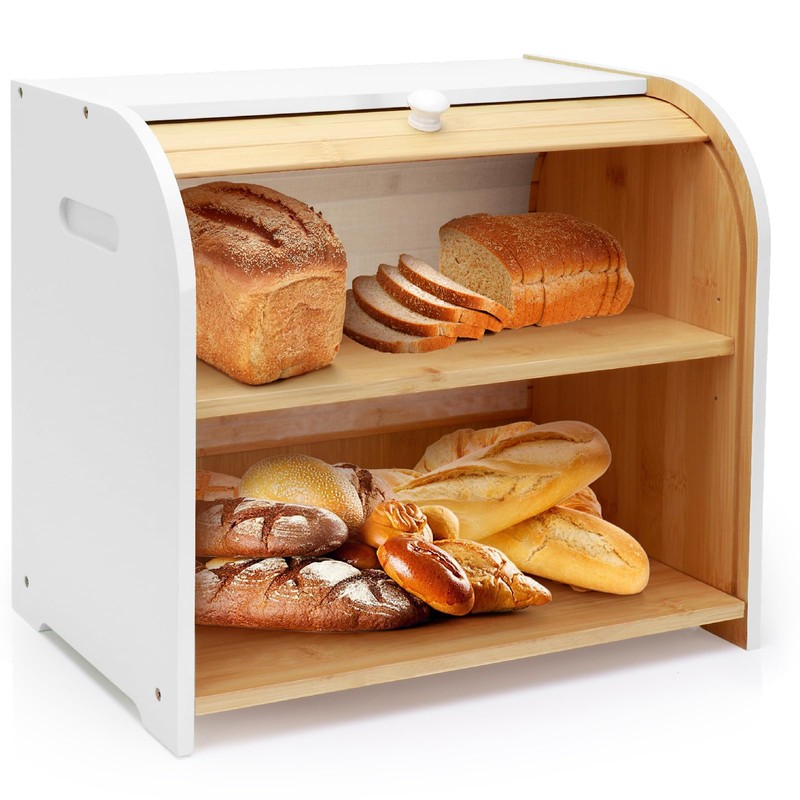 Thalomely Bread Box for Kitchen Countertop, Double Layer Bamboo Bread Storage Container for Homemade Bread, Roll Top Bread Box with 3 Adjustable Height for Kitchen Counter, White Breadbox Organizer