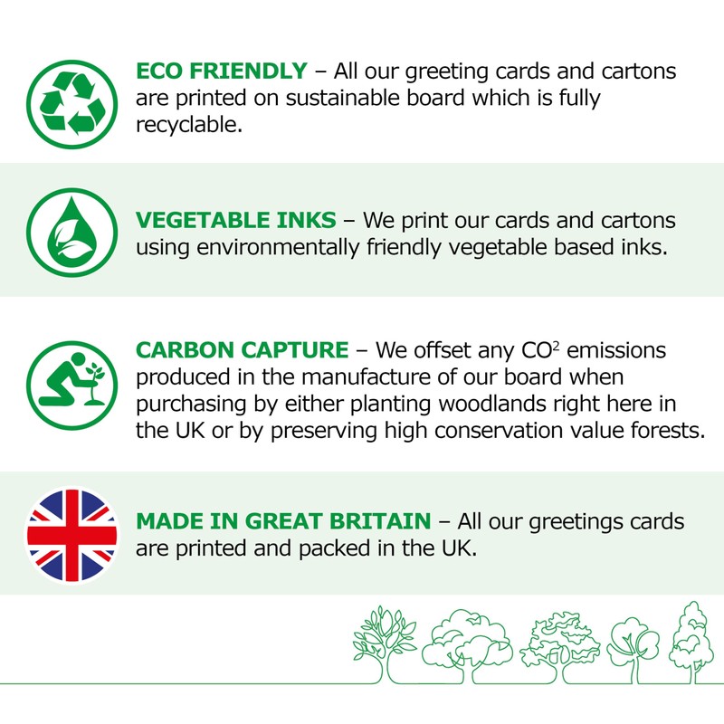 When printing our cards and boxes we only use vegetable inks as they are fully sustainable, eco-friendly and help keep our natural world healthy. Where possible we source our materials locally from the UK or Europe.