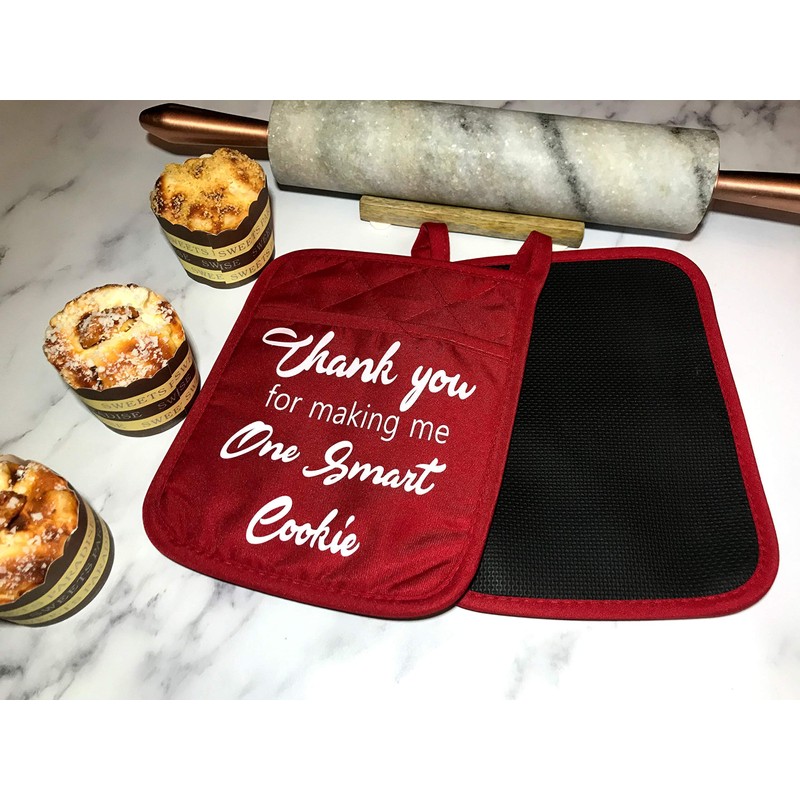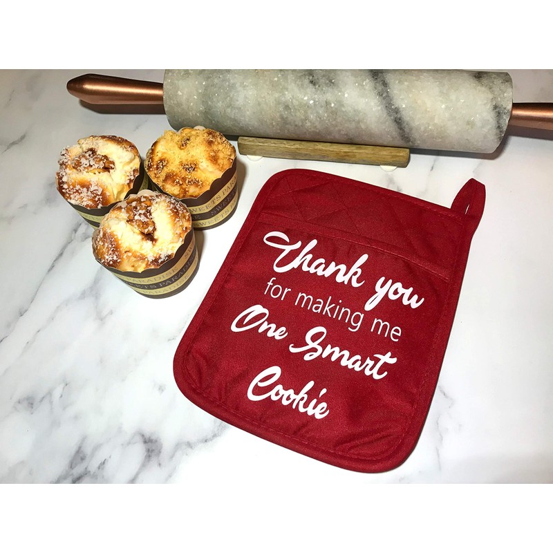Thank you for making me one smart cookie baking mitts make great gifts for teachers of all kinds to show your appreciation. Great for teacher appreciation week, end of the year, Christmas, or just because.