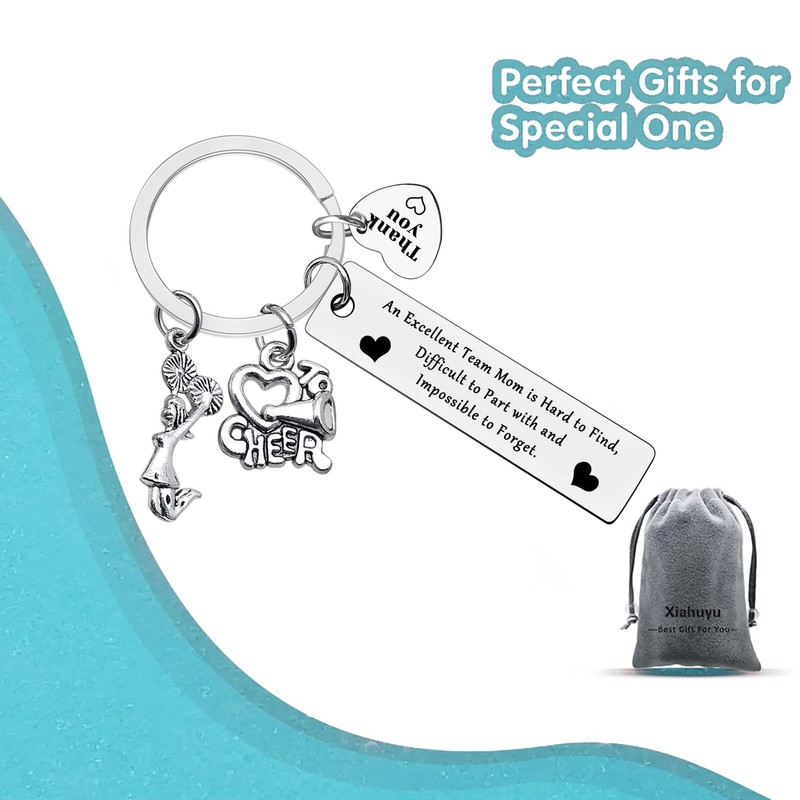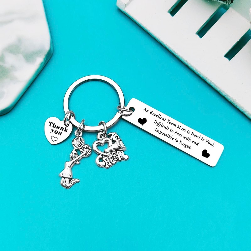 - Cheer Team Mom Gifts: The keychain engraved with "An Excellent Team Mom is Hard to Find, Difficult to Part With and Impossible to Forget" with a "Thank You "charms. A lovely way to express gratitude and appreciation to a special cheer mom.