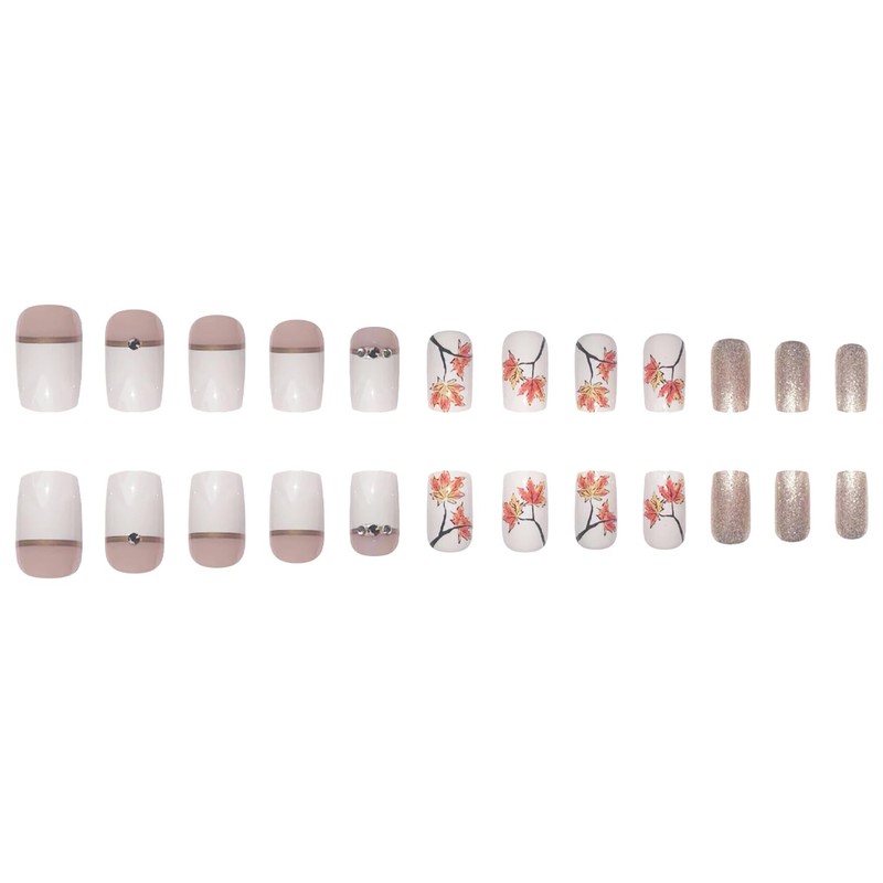 - Package: You'll get 24 french maple leaf false nails in 12 sizes. 1 mini nail file, 1 small wooden stick, 1 piece of nail glue sticker. Glue on nails are perfect for most people's nails