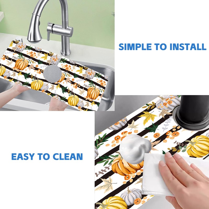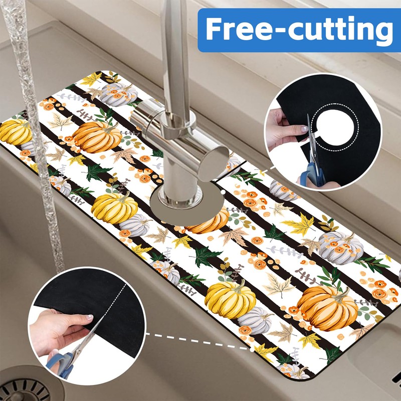 Thanksgiving Sink Faucet Absorbing Mat Autumn Pumpkin Floral Absorbent Fast Drying Mat Faucet Draining Mat Sink Splash Guard Behind Faucet Drip Catcher for Kitchen Bathroom 5.5"×15"