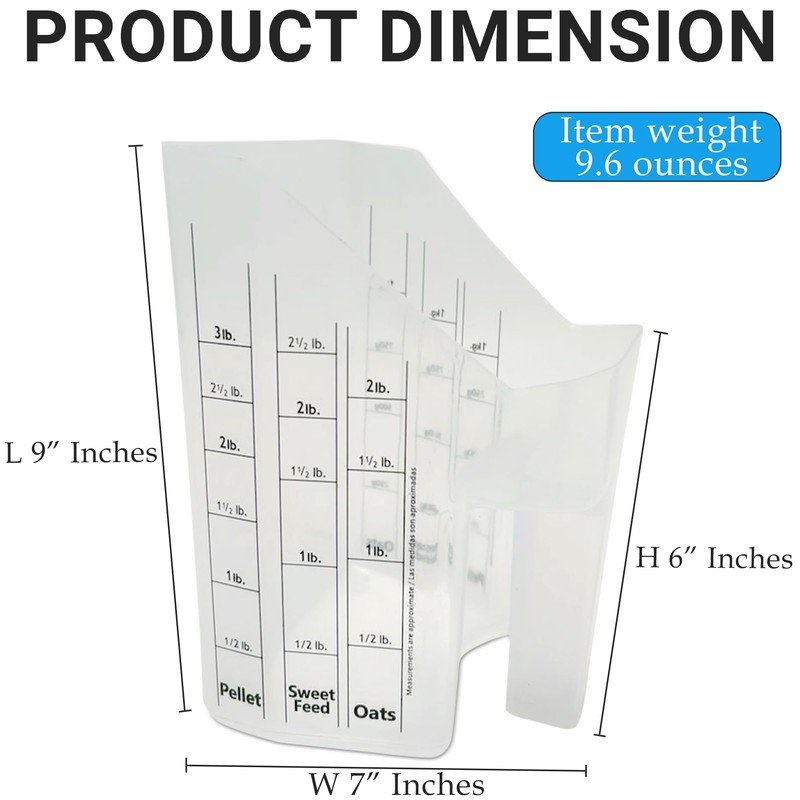 - 📏Measurement Markings: Clearly marked measurements on the side of the scooper (in both cups and ounces) help you measure the exact amount of feed for your animals, promoting optimal feeding and preventing waste.