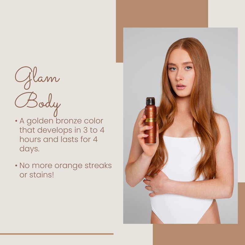 - GLAM BODY AND ON THEGO SELF TANNER: Intense and long-lasting instant tan spray for a golden bronze natural pigment which develops in the 3-4 hours following application and can persist for 4 days.