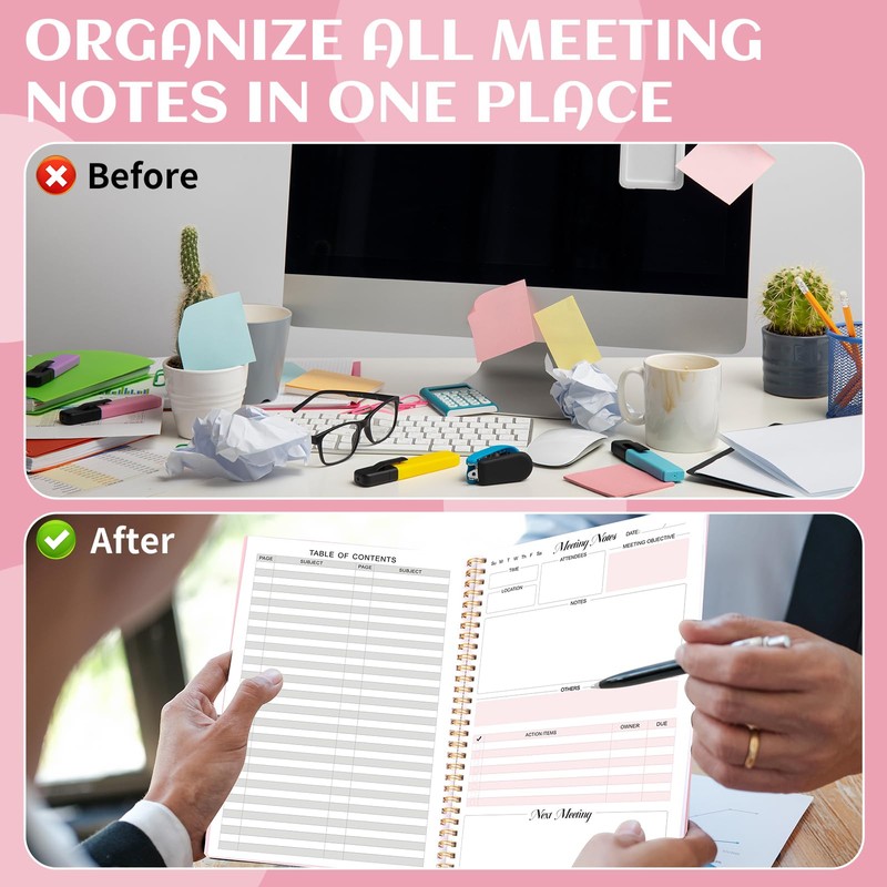 - 【Good Layout & Stay Organized】The meeting planner notebook contains basic items of the meeting, such us time, location, attendees, meeting objective, notes, and action items, etc., helping you better organize and track meetings. It also includes table of contents to help you easily find meeting information
