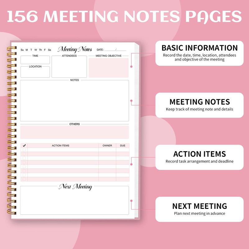 Thboxes Meeting Notebook for Work, 160 Pages Work Notebooks for Note Taking with Action Items Project Planner Notebook for Women, Pink(6.9" X 9.9")