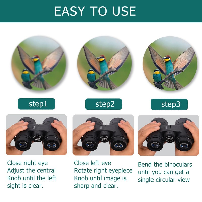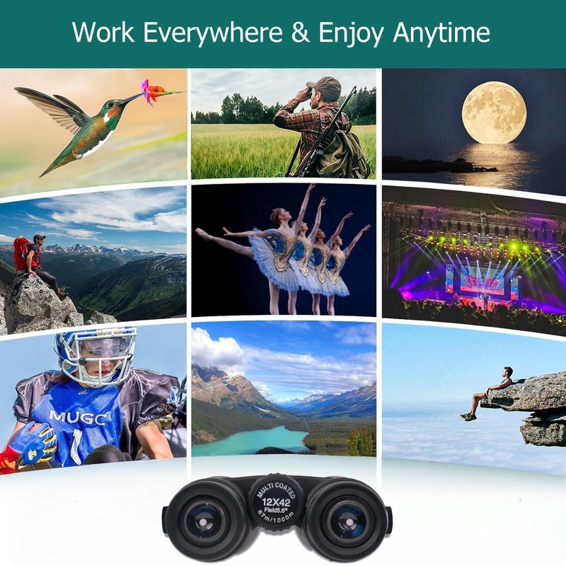 - 12X High Power Magnification For Clear Vision: These binoculars feature 12X magnification and 42mm objective lenses, offering a bright, wide field of view. Whether observing wildlife, attending sporting events, or exploring scenic landscapes, they provide clear and detailed imagery from afar