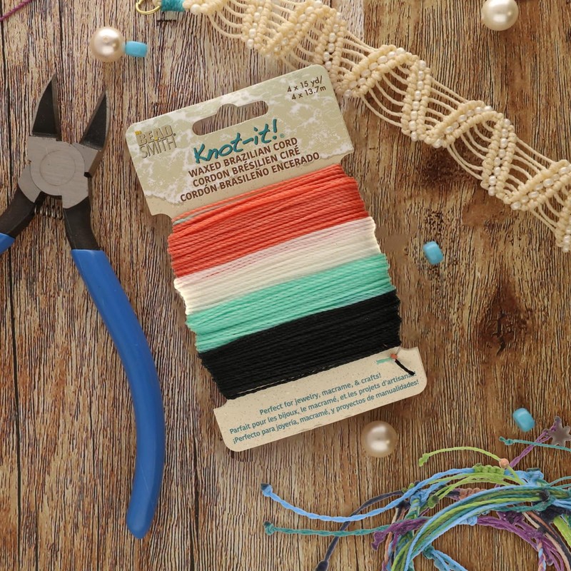 - CONSTRUCTION: 100% Waxed Polyester, TEX 480 2-ply twisted cord. The cord's colors are white, black, salmon and seafoam, it measures 15yd (13.72m) in each color and is 1mm thick. The card measures 4.5” x 2.75” (114.3mm x 69.85mm). Product colors may vary across different screens.
