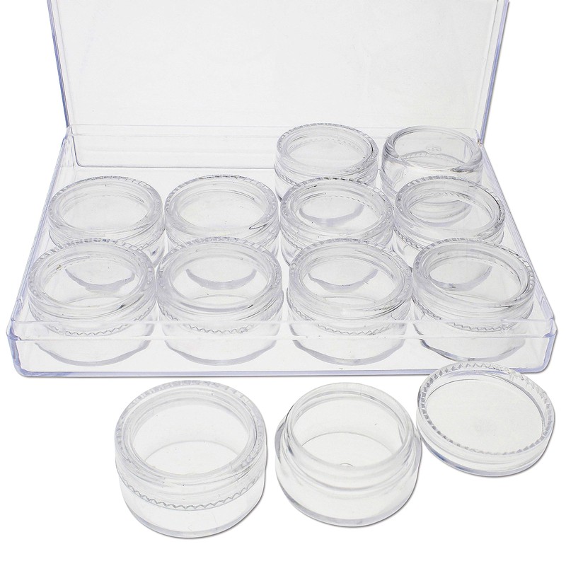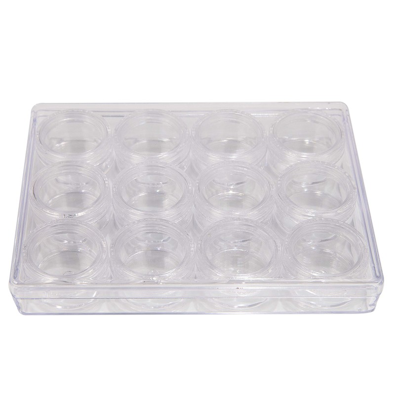 - DIMENSIONS: Clear organizer bin measures 5 x 3.75 x 0.9 inches and includes 12 1.2 x 0.7 inches jars with lids.