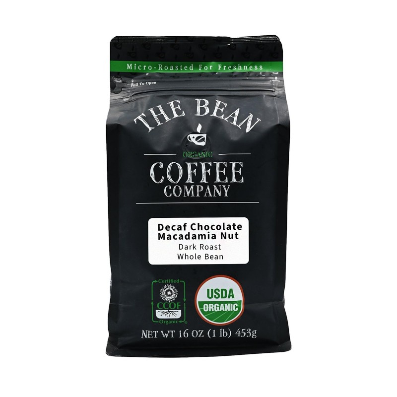 The Bean Organic Coffee Company Water Processed DECAF Chocolate Macadamia Nut, Medium Roast, Whole Bean Coffee, 16-Ounce Bag