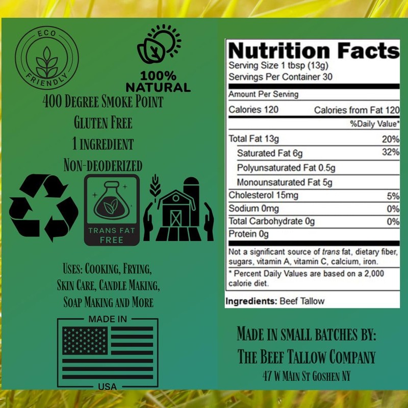 The Beef Tallow Company | 100% Pure small batch pasture raised beef tallow | Dry rendendered, non deoderized for rich beef flavor| Saftey shrink sealed glasss jar | Locally sourced and made in the Hudson Valley | No additives, No preservatives, All Natural , Keto, Paleo friendly | No GMO, Microplastic free