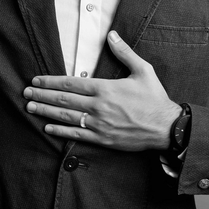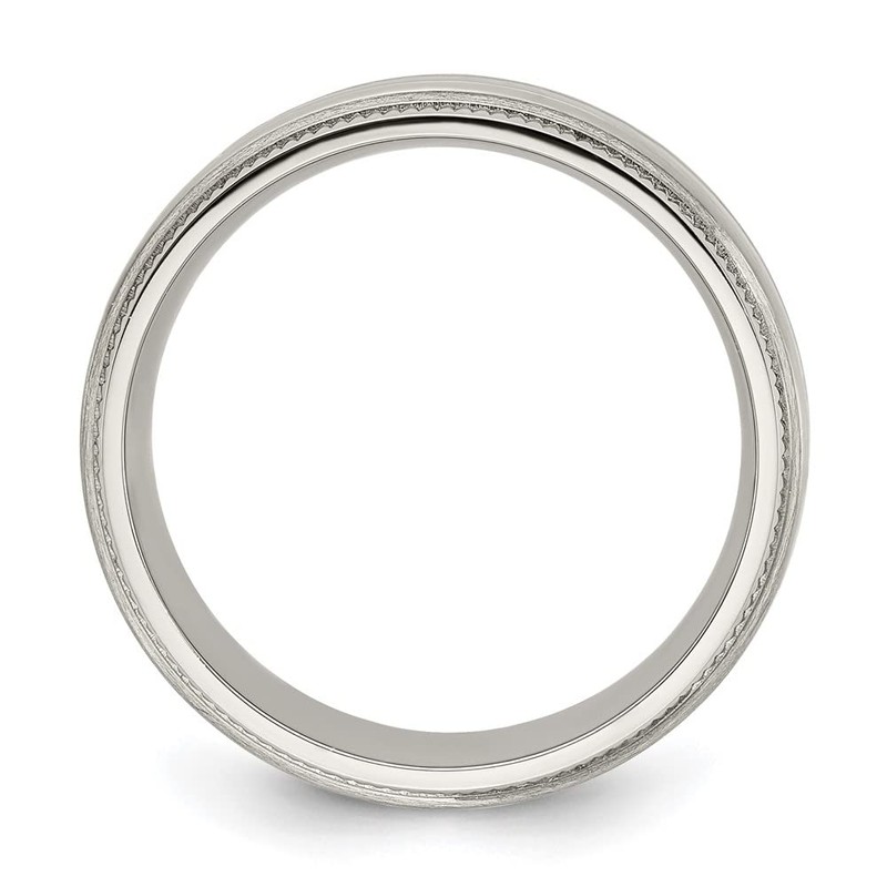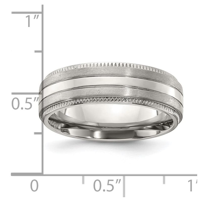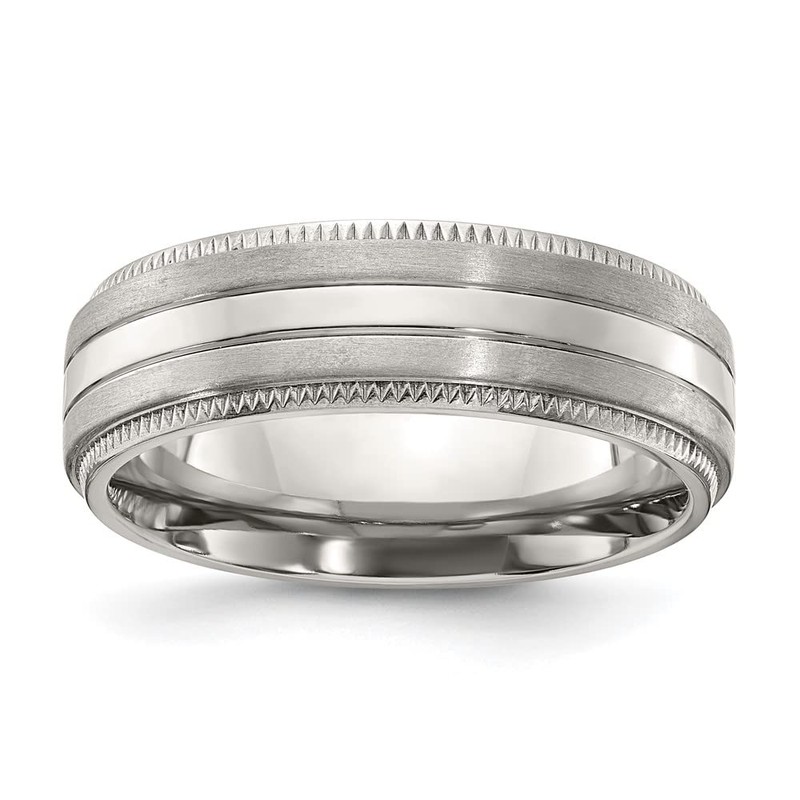 - UNIQUE FEATURES - A trendy modern design featuring a brushed and polished grooved center with textured ridge edges and a polished standard-fit shank created from durable titanium. This unique band is approximately 7mm in width and is suitable for engraving.