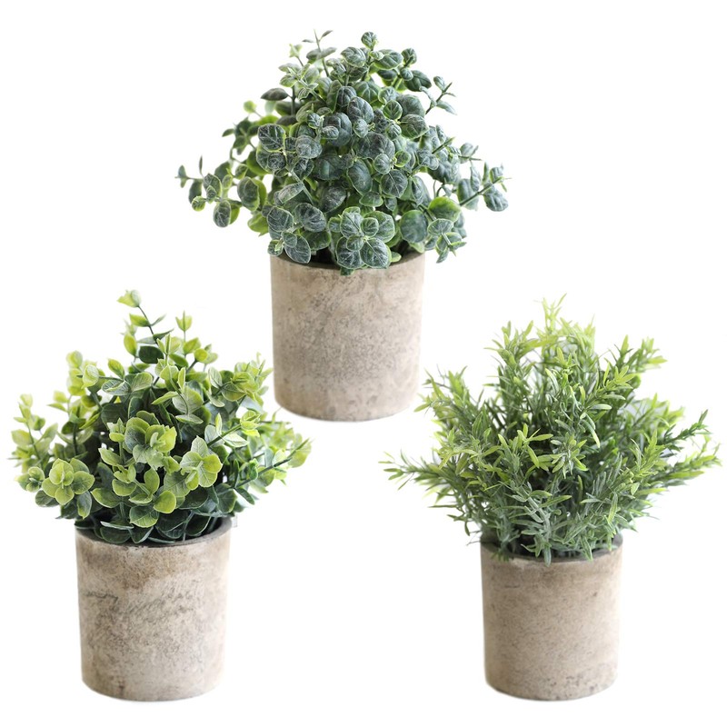 THE BLOOM TIMES Set of 3 Small Potted Artificial Plants Plastic Fake Greenery Faux Plants in Pots for Rustic Home Office Desk Farmhouse Bathroom Kitchen Indoor Decor