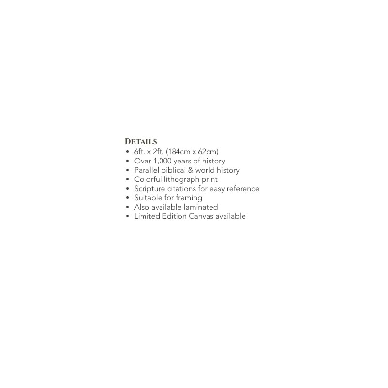- 6ft. x 2ft. (184cm x 62cm) Over 1,000 years of history Parallel biblical & world history Colorful lithograph print Scripture citations for easy reference Suitable for framing Also available laminated Limited Edition Canvas available