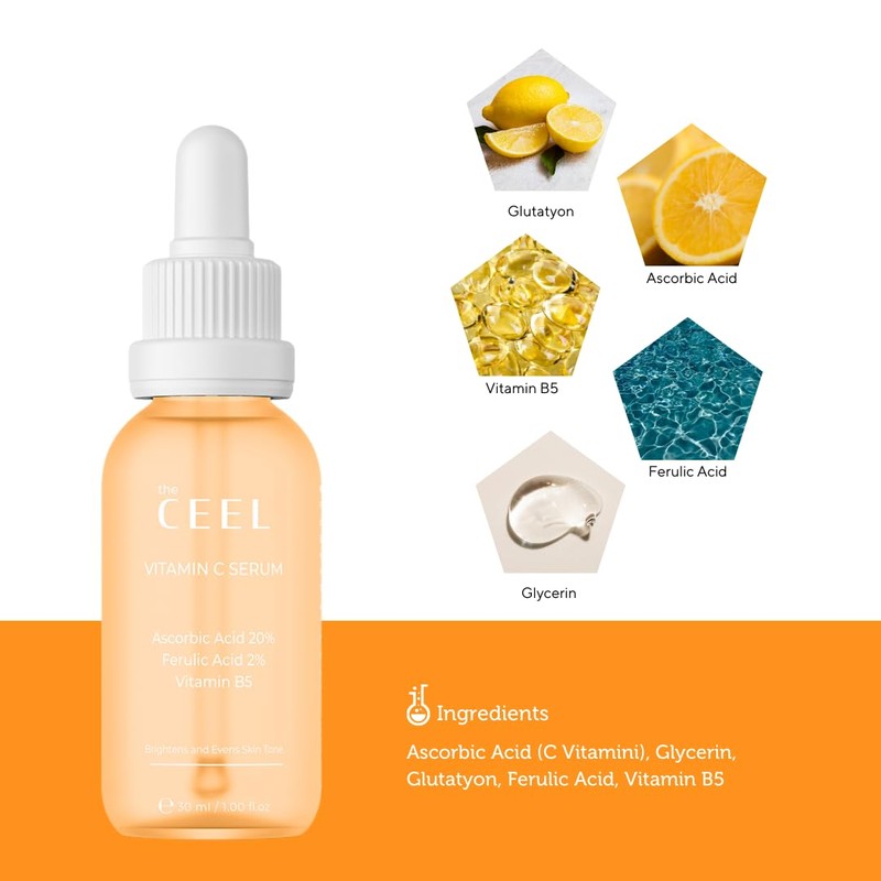 - Experience brighter and more even skin: Our Ceel Vitamin C face serum offers you a more radiant and even complexion thanks to the 20% pure vitamin C, also known as ascorbic acid, ferulic acid and vitamin B5. With regular use, this vitamin C serum helps improve skin texture and tone by reducing dark spots and providing a smooth, even complexion.
