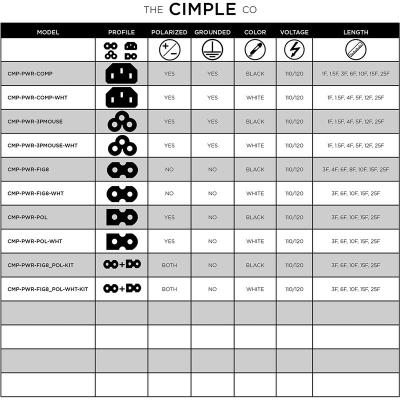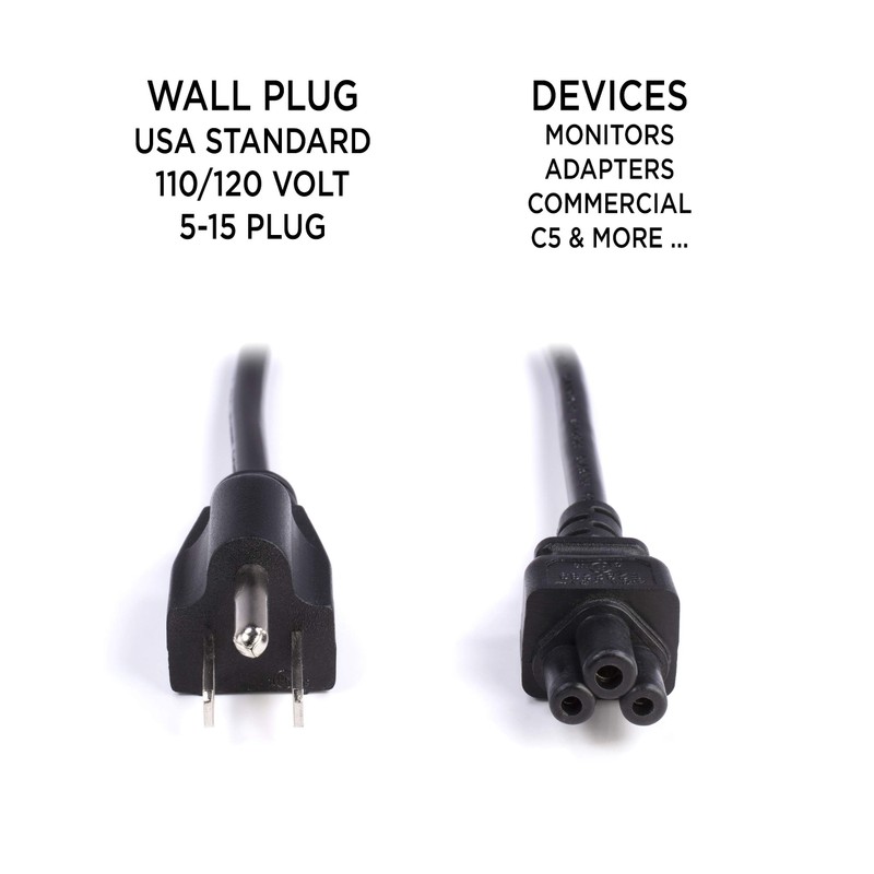 **Introducing the 3 Prong (Mickey Mouse) AC Power Cord by The CIMPLE CO** This AC power cord is generally used for PC's laptops and other power supplies. It possesses the standard 3 prong plug that connects to your receptacle, with the C5 connector, which is often referred to as having a Mickey Mouse or Clover Leaf pattern. **COMPATIBLE WITH MANUFACTURERS LIKE:**