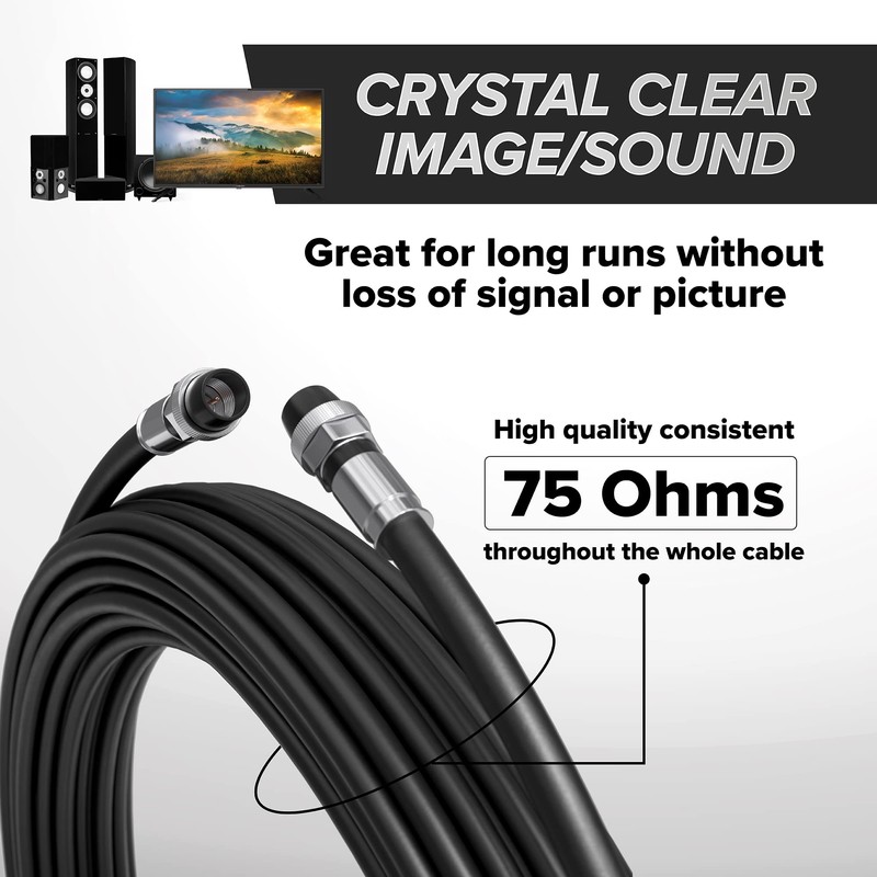 - Low loss Cable for exceptional signal and picture quality, even over long runs. Works great indoors and outdoors, with a highly durable weather proof and UV resistant PVC outer jacket. High quality consistent 75 Ohms throughout the whole cable.