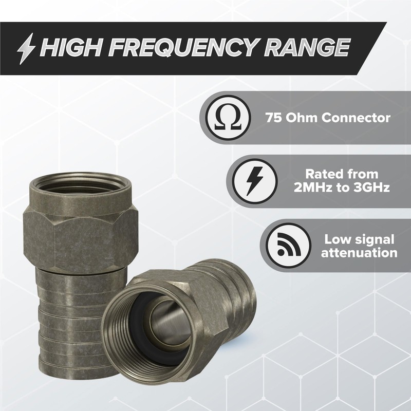 F81 Connectors, using the F-Pin connection (standard on US Cable systems). Rated from 2MHz 3GHz, this ensures that the coupler will handle all of the signals for DIRECTV, Satellite Dish, other Satellite, CATV (including Comcast, Charter, Cox, and more), as well as Antennas, VCRs, Cable Internet Modems, and other digital and analog systems. These will pass signal for 75Ohm coax wires. The connector works with most RG6 Coax, including Dual Shield, Tri Shield, and Quad Shield. Exceptional return loss and insertion loss specifications.
