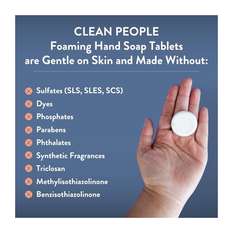 • BECAUSE INGREDIENTS MATTER: CLEAN PEOPLE Foaming Hand Soap Tablets contain NO Dyes, NO Phosphates, NO Parabens, NO Phthalates, NO Synthetic Fragrances, NO Triclosan, NO Methylisothiazolinone, and NO Benzothiazolinone. Gentle on skin, made with Essential Oils & Plant Extracts. Vegan. Cruelty Free. Dermatologist Approved.