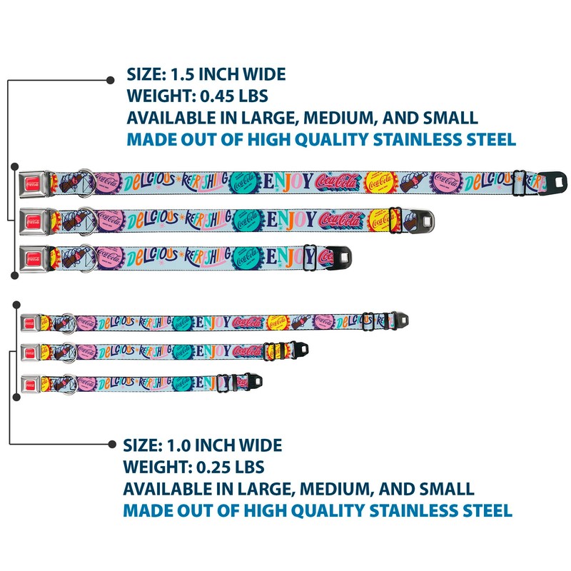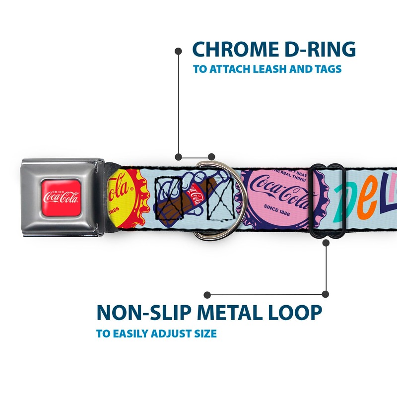 The Coca-Cola Company Pet Collar, Dog Collar Metal Seatbelt Buckle, Coca Cola Delicious Refreshing Enjoy Bottle Caps Multi Color, 15 to 24 Inches 1.0 Inch Wide