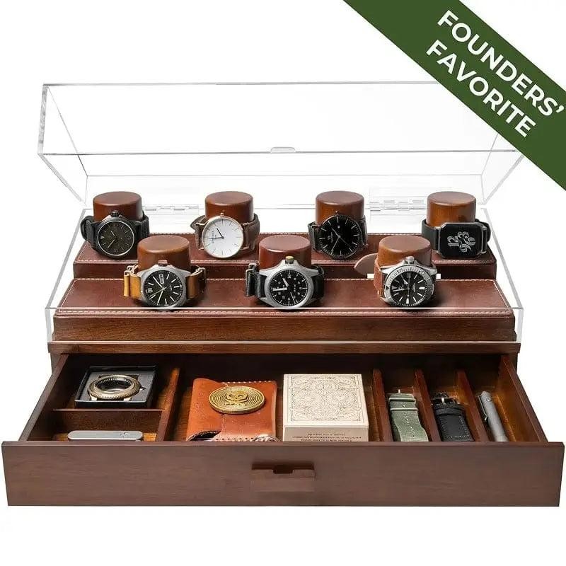 Why collect nice watches without a proper watches box to display them? The hinged acrylic cover on this collectors watch box keeps the dust off your watches while providing a fantastic 360-degree view of 7 of your best timepieces. The large wooden drawer beneath provides storage for your everyday accessories