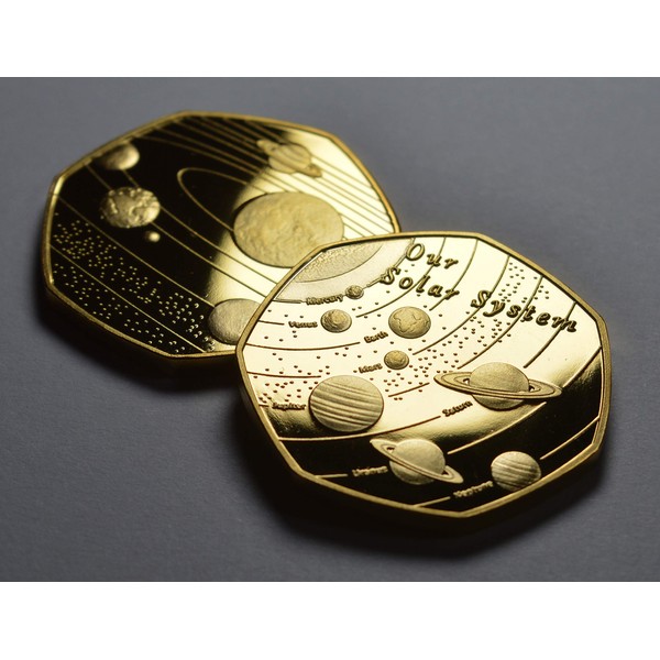 A brand new collectable, commemorating our Solar System and the planets within it. This proof finish, seven sided commemorative weighs 8g and has a diameter of 27mm. Finished in 24ct Gold. The last picture is for comparison next to a 50p coin - perfect to add to albums and collections. Very collectable - an excellent gift idea - perfect for anyone with an interest in coin collecting, the UK coin hunt etc. At The Commemorative Coin Company we sell Royal Mint 50p coins as well as our own own range of exclusive Commemoratives.