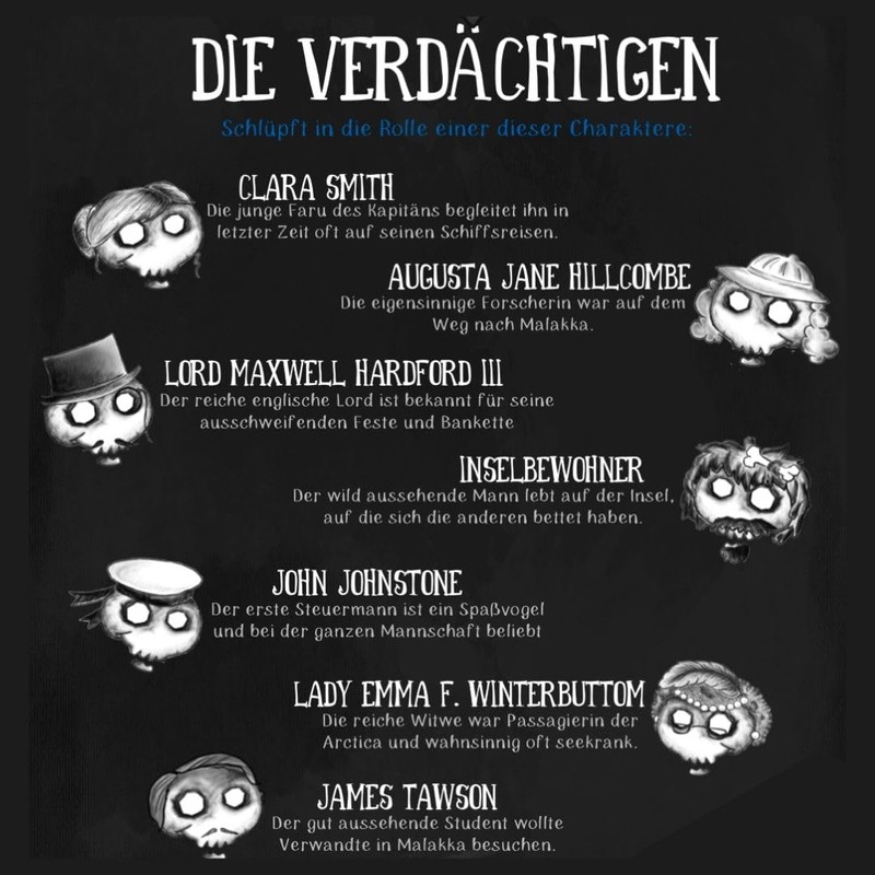 - Plus, there are no optional characters. If the group is not filled with all seven roles, the game adapts and the other suspects are taken over from the game. Depending on the group size, it can also happen that the criminal is played by the game.