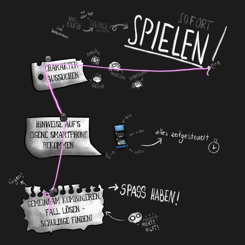 - The game is not turn-based, but is played in a game flow. The notes come in small "appetizers", similar to a messenger message. However, it is possible to pause and start again at any time, so that a game without or with matching dinner is possible. In addition, all players (including hosts) are equally suspicious; the detective is played by the game and always explains to the group what to do next - so the game management does not have to be taken over by one of the people present.