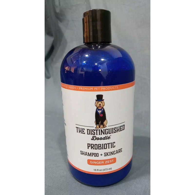 The product is "The Distinguished Doodle Probiotic Dog Shampoo + Skincare Ginger Zest" in a 16fl oz bottle, specifically designed for Doodles. It combines the benefits of probiotics to promote a healthy skin microbiome with the refreshing scent of ginger zest for a spa-like grooming experience. This premium dog shampoo is formulated to not only cleanse but also nourish and improve the skin health of Doodles, making it an essential part of their grooming routine.
