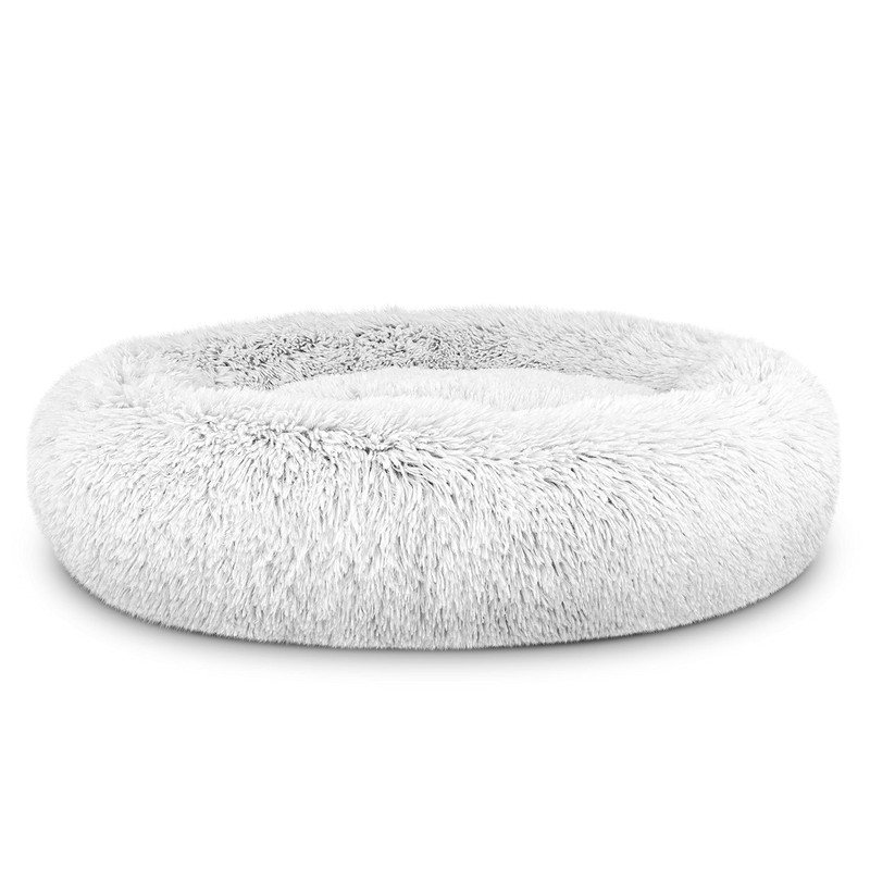 - Medium Ice White Fur 30 inch diameter round deluxe Fur dog bed. 1.5 inch vegan fur contours into a deep & luxurious comforter for your cherished best friend as well as a charming room accessory, injecting style into your lounge or bedroom interior