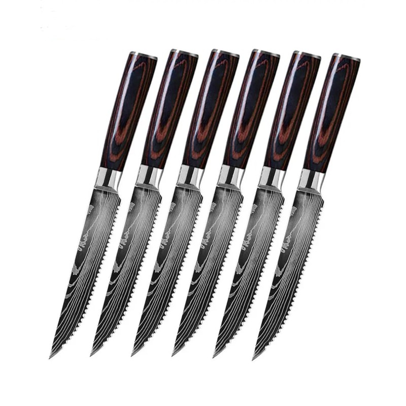 - ELEGANTLY DESIGNED PERFECTION - Uniquely stylish, each knife boasts a polished wooden handle for a comfortable, balanced grip. Striking Damascus patterned blade adds a touch of sophistication to your table setting. Embrace the art of dining with knives that marry form and function seamlessly.