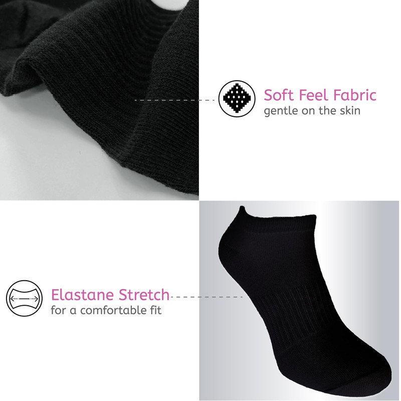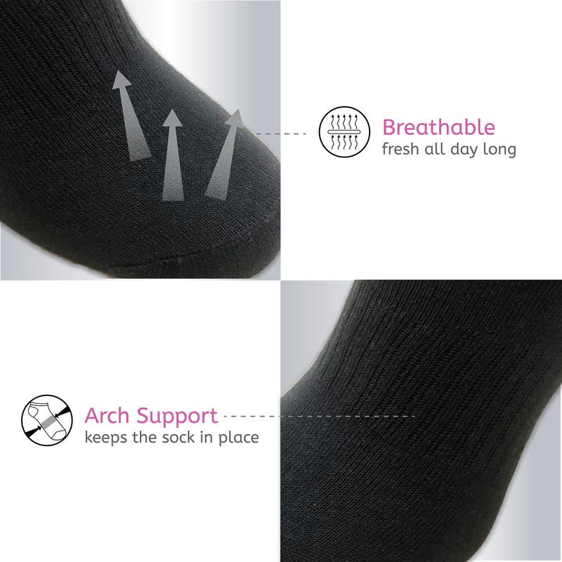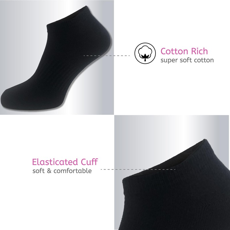 - Bulk Pack: Our ladies trainer liner socks come in a pack of 12 pairs, featuring a comfortable elasticated top, arch support, and elastane stretch for a comfortable fit. Available in multiple colours, including black and white they add a vibrant touch to your sock collection. These breathable cotton socks ensure your feet stay fresh all day.