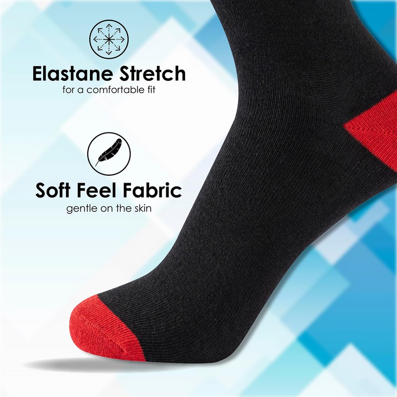 - Cotton Blend with Elastane Stretch: Made from 50% Polyester, 48% Cotton, and 2% Elastane, these kids cotton blend socks offer a stretchy, snug fit that adapts to boys’ shoe sizes. The fabric’s wash-resistant design keeps the socks soft and in great shape after machine washing at 40°C. Available in black and black with coloured heels and toes.
