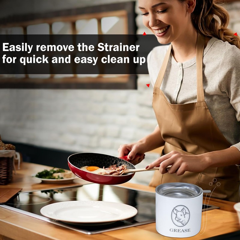 - 🥓 Stainless Mesh Strainer: Equipped with a high-quality stainless steel mesh strainer, our grease container for kitchen effectively filters out even the smallest particles, ensuring you save only the purest, cleanest bacon fat for future use.