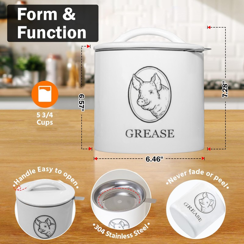 - 🥘 Modern Kitchen Must Have: The sleek white finish, complemented by a charming design, infuses a rustic elegance into the kitchen. Our ceramic grease container makes the perfect accent for modern farmhouse kitchen décor.