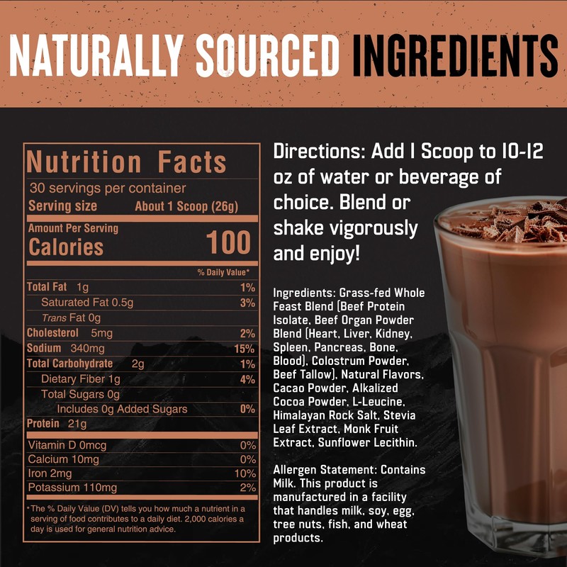 - Whole Feast formula features beef isolate protein powder with 21g of protein, 14g of collagen peptides. Contains liver offering naturally occurring B12, choline, folate and iron. Also offers Colostrum which supports immune function, gut health and growth factors. 30 servings per bag.