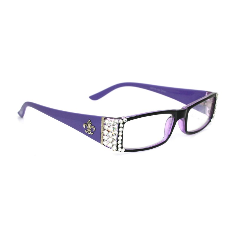 The French, (Bling) Fleur De Lis Women Reading Glasses Adorned with (Clear + Aurora Borealis) Austrian Crystals, Magnifying (Purple) Rectangular. NY Fifth Avenue.