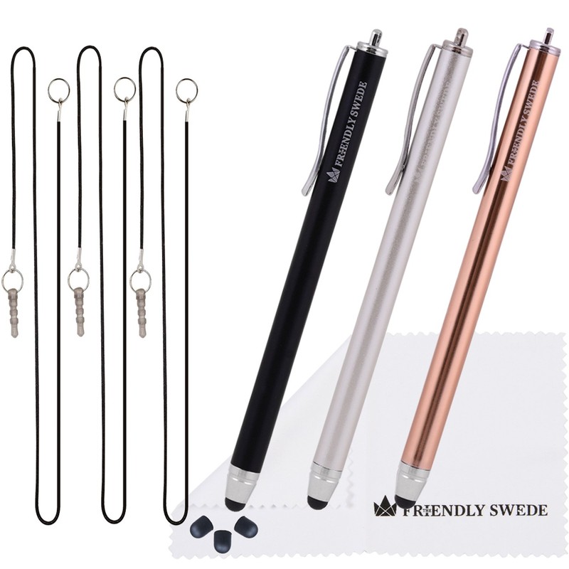 The Friendly Swede Stylus Pen for Touchscreen — 3-Pack 5.5" High Precision Stylus Pen with Replaceable Thin Tips, Elastic Lanyards & Screen Cleaning Cloth - Gold/Silver/Black