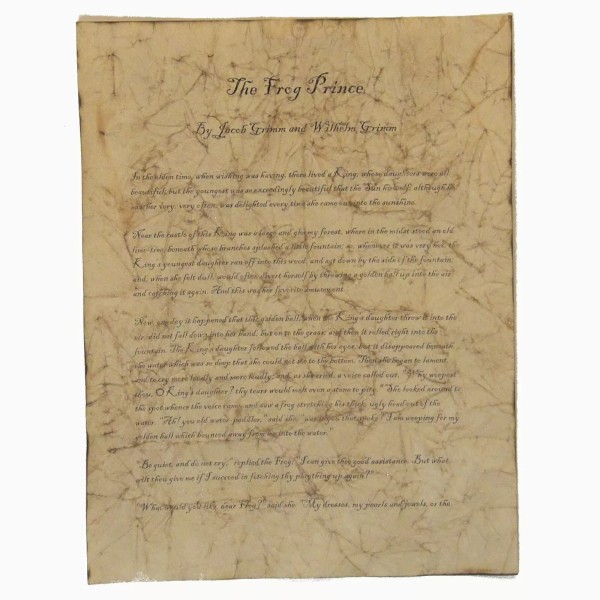 The Frog Prince can now be remembered and cherished with this antiqued copy of the first page of the classic fairytale. Whether framed on a wall or used as part of a centerpiece, this beautifully aged paper will be loved by any Princess and the Frog fan. Our four step aging process transforms regular paper into paper that looks hundreds of years old. It not only LOOKS antique, but it FEELS antique, as well!