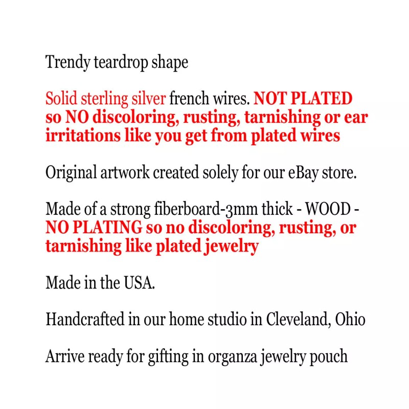 No plating means no fading, no discoloring, tarnishing, or rusting like plated jewelry. These are created on treated fiberboard (wood) with solid sterling silver wires.