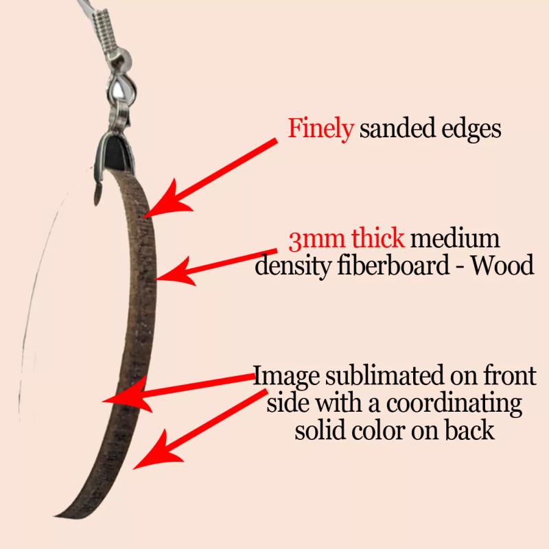 The original artwork is printed using an Epson Ecotank professional photo printer with top quality dye-sublimation ink on HTVRONT sublimation paper. The image is then cut to size and professionally heat pressed onto the prepared medium density fiberboard (MDF) wooden teardrop shapes. The image is sublimated on the front with a coordinating solid color on the back.