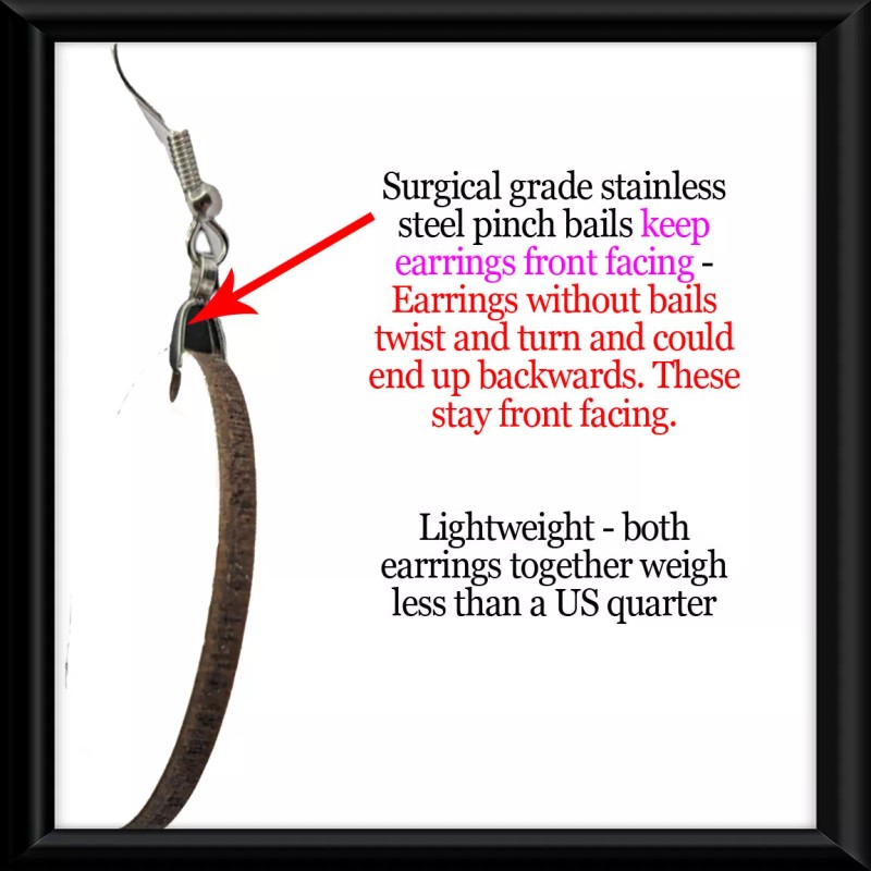 • Features: Nickel-Free, Lead Free, Made in the USA, Handcrafted in Cleveland, Ohio, Hypoallergenic, Lightweight, Small Home Business, NO PLATING - so NO TARNISHING, DISCOLORING, OR EAR IRRITATION, SURGICAL STAINLESS STEEL FRENCH WIRES, Secure Pinch Bails keep earrings front facing