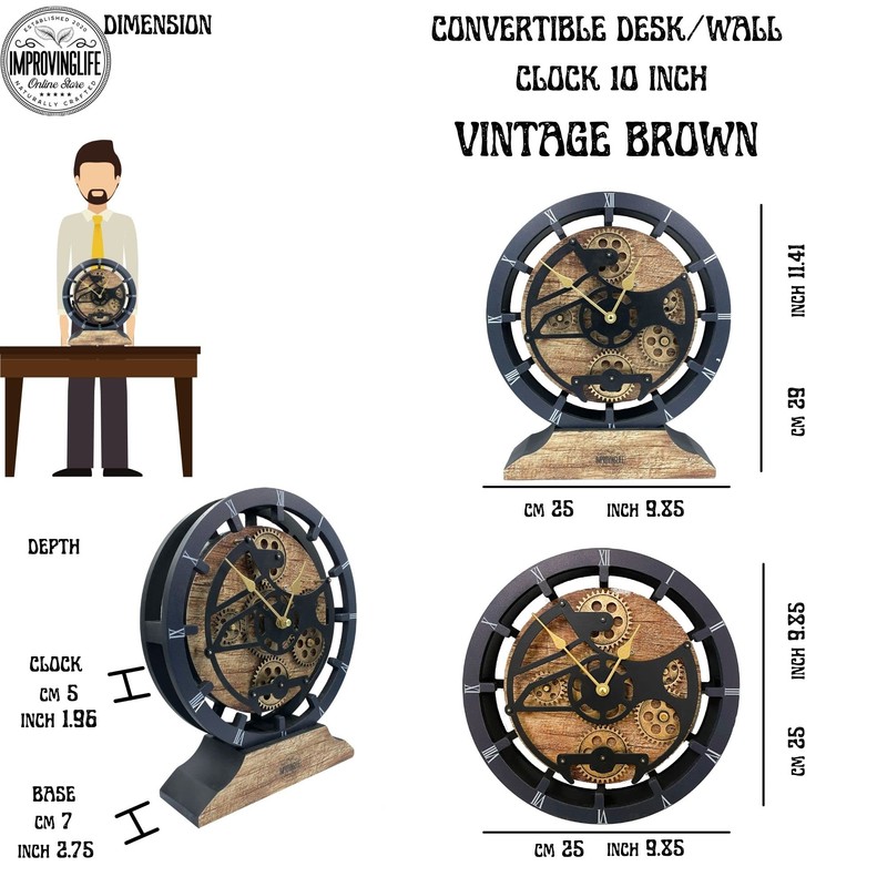 The Gears Clock Desk Clock 10 inches with Real Moving Gears Convertible into Wall Clock (Vintage Brown)