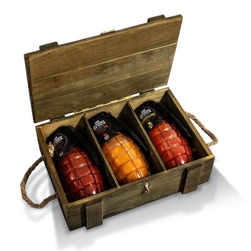 The General's Hot Sauce 3-Star Ammo Crate. Three 6 oz Bottles of Gourmet Hot Sauce Made With American-Grown Cayenne and Habanero Peppers. Dead Red| Danger Close| Shock & Awe…