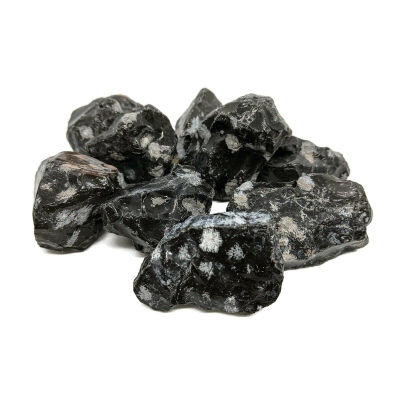 - 1 pound rough Snowflake Obsidian. Pieces range in size between 1 - 2 inch. Wash stones off after recieving to display their best color.
